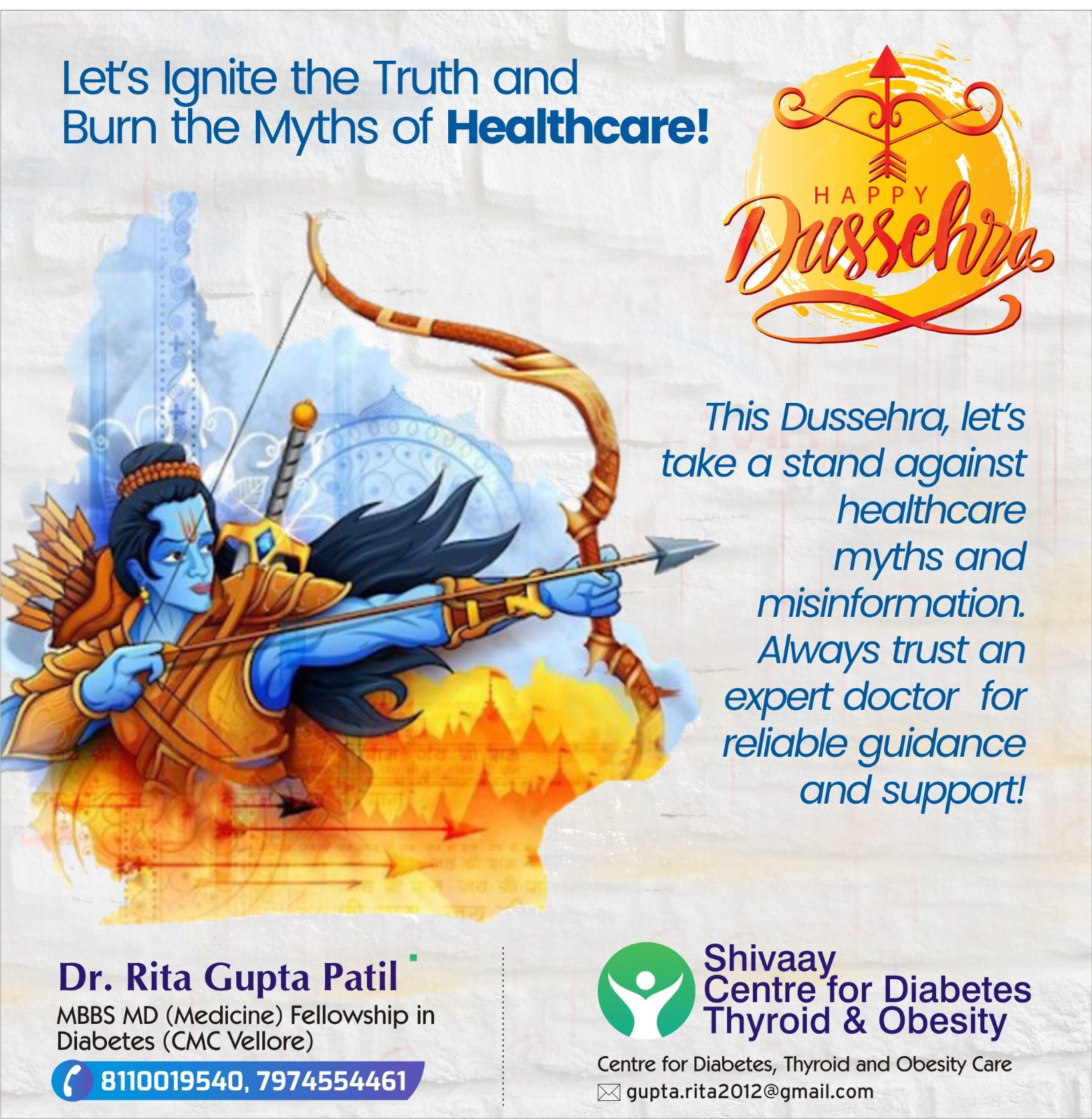 Wishing you a joyful Dussehra filled with happiness and prosperity. - Dr. Rita Gupta Patil